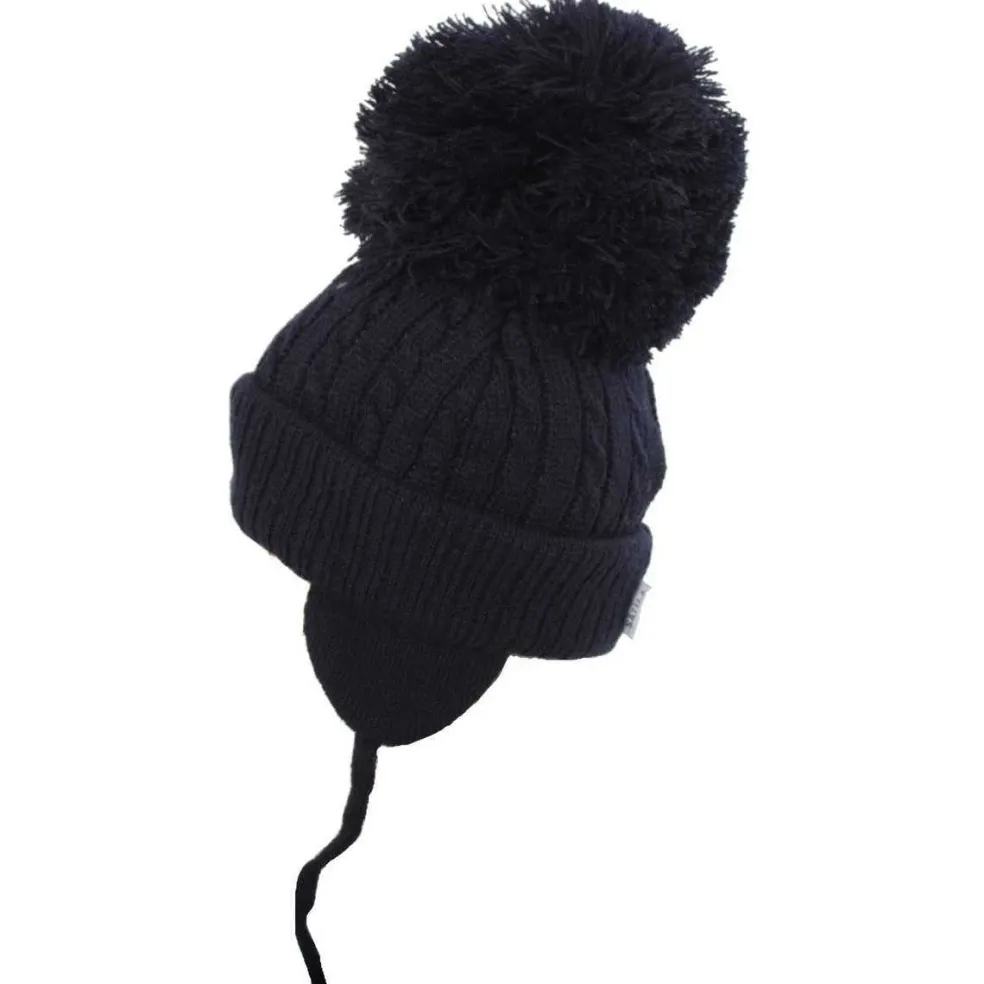 Knitted hat with a large pom pom, ear flaps and tie fastening. Hat has a half knitted cotton lining for extra comfort and warmth.