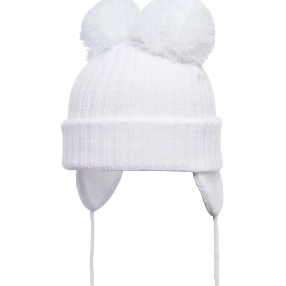 Knitted hat with 2 small pom poms, ear flaps and tie fastening. Hat has a half knitted cotton lining for extra comfort and warmth.
