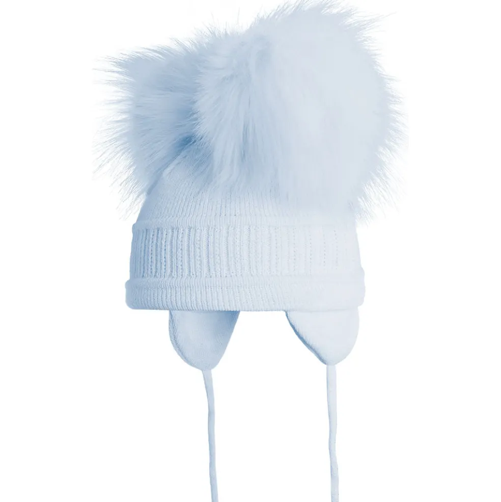 Knitted hat with double faux fur pom poms, ear flaps and tie fastening. Hat has a full soft cotton jersey lining for extra cofort and warmth.
