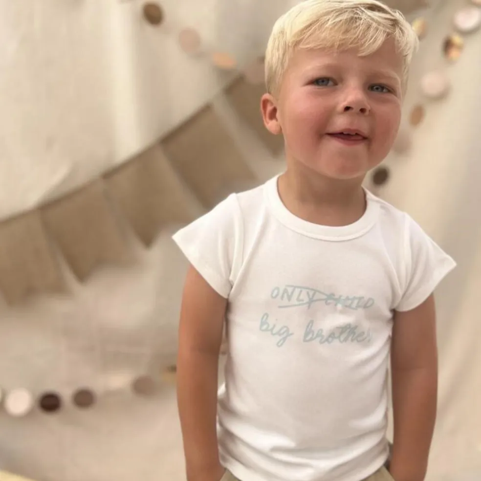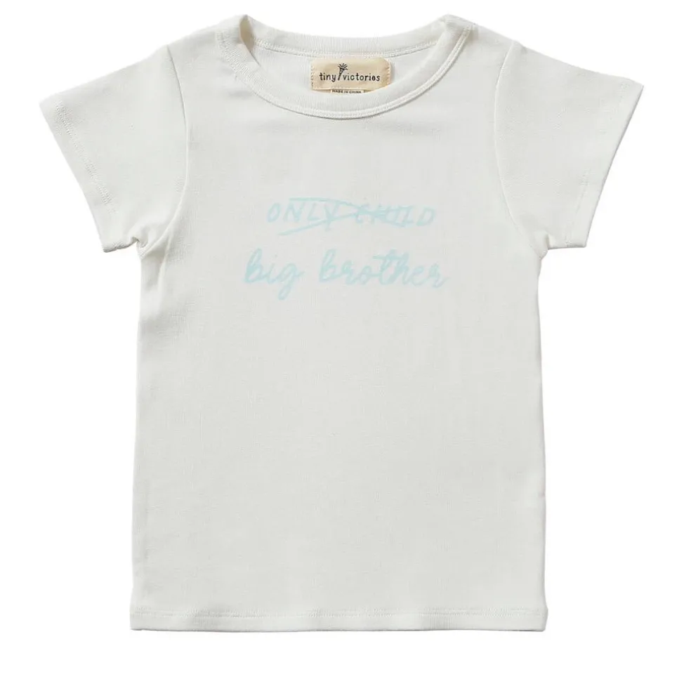 Short sleeved t shirt with only child crossed out and big brother printed across the front.