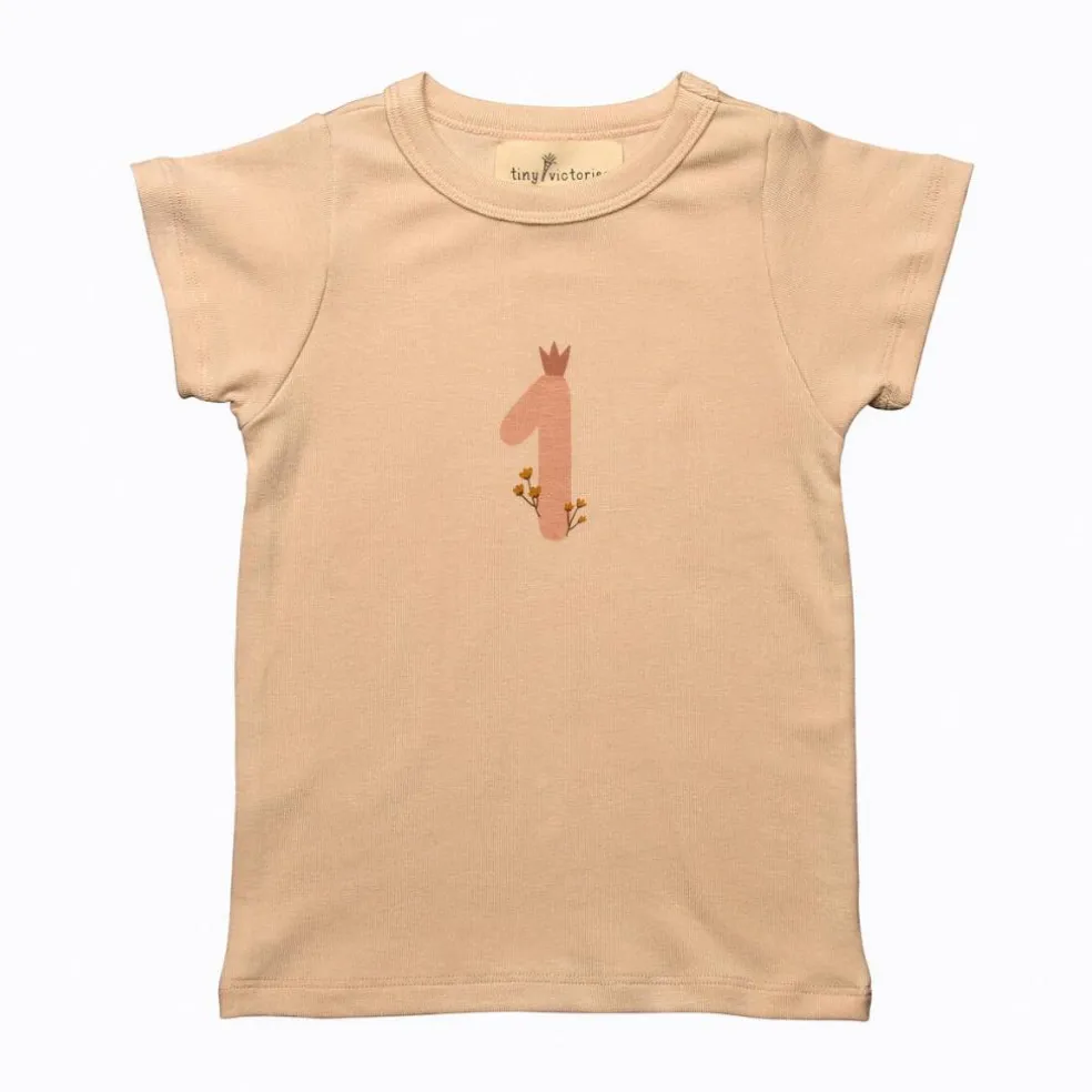 Unisex Age 1 birthday t shirt with a crown print and number 1 on the front, short sleeved and a round neckline.