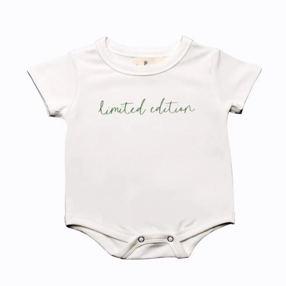New Baby short sleeved bodysuit with “limited edition” printed across the front.