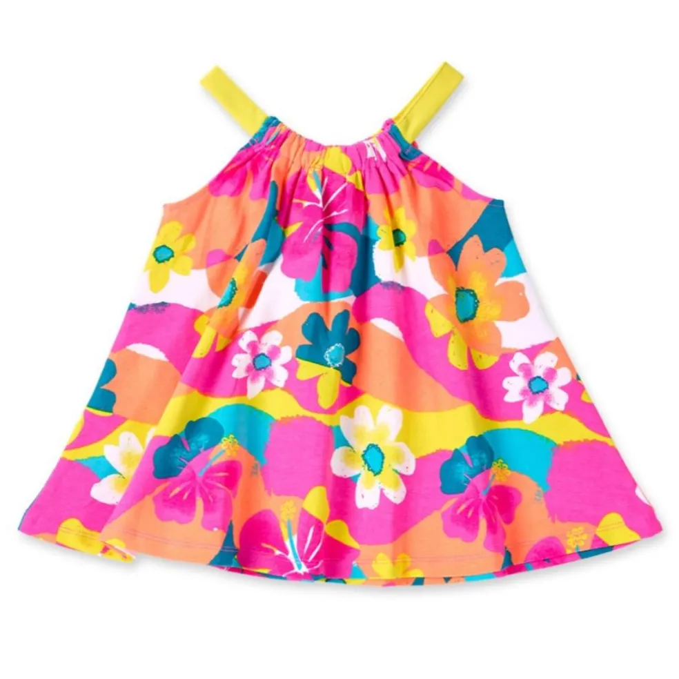 Easy to wear jersey floral print sundress with contrasting yellow straps and elasticated round the neckline for a better fit.
