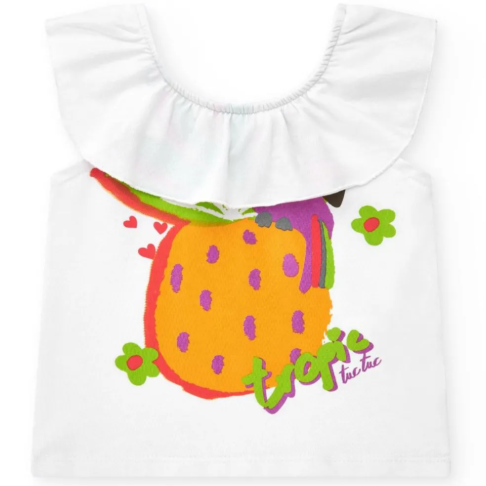 Sleeveless t shirt, elasticated aroundthe neckline finished with a ruffle. The t shirt has a bright tropical printed design on the front, matching tropical print shorts have a fully elasticated waistband finished with an appliquéd bow on the front.