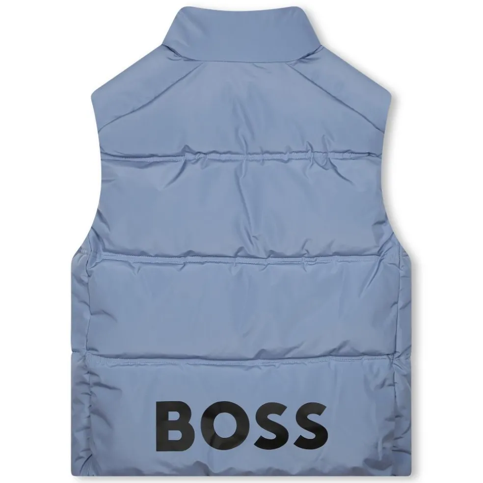 This BOSS water-repellent sleeveless puffer jacket keeps you warm while retaining a casual look. It is made of 100% polyester with a zip fastening and side pockets and features the BOSS logo in a contrasting print at the bottom of the back.