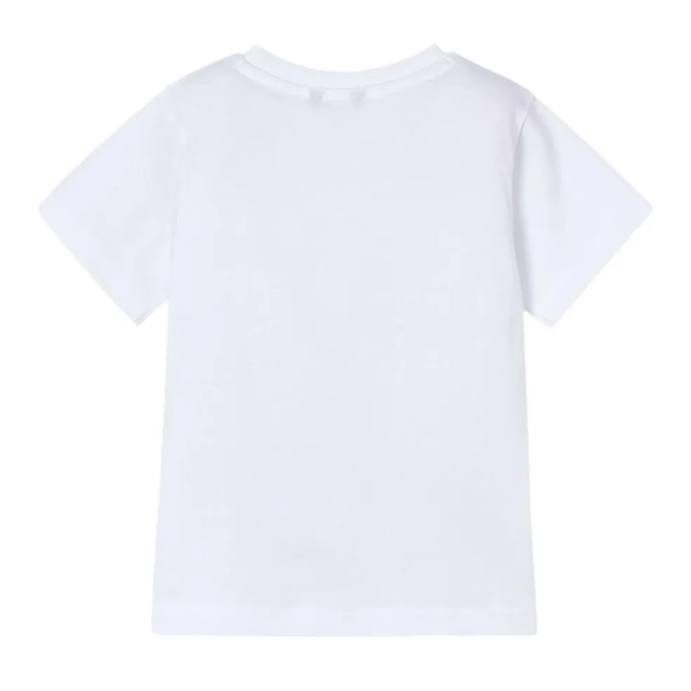 Short sleeved t shirt with a round neckline finished with a printed and appliquéd bag across the chest.