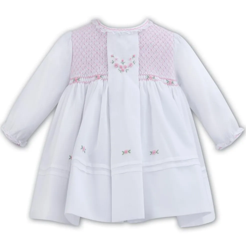 Long sleeved fully lined dress has a round neckline with a lace trim and is finished with hand smocked and hand embroidered detailing.
