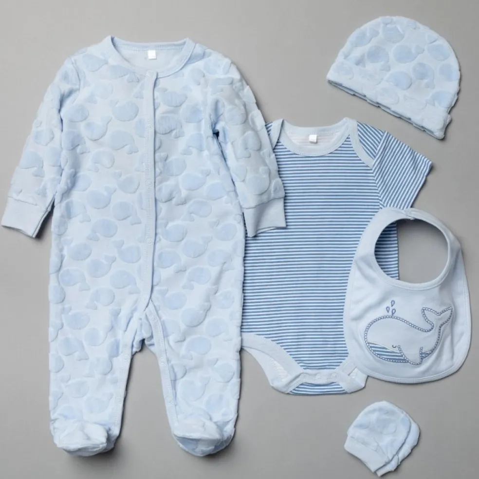 5 Piece gift set including Bib, Bodyvest, Hat, Sleepsuit, Mittens
